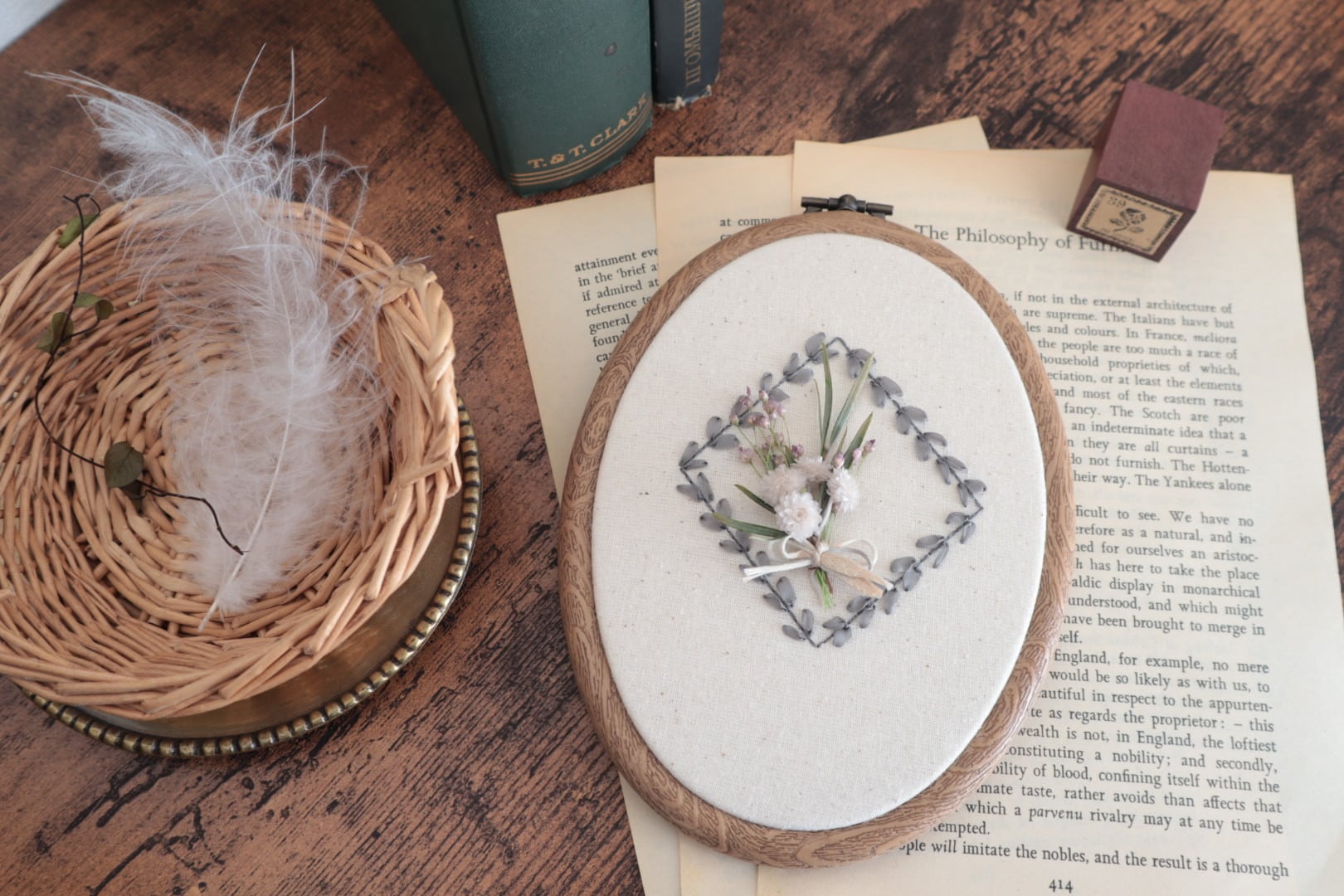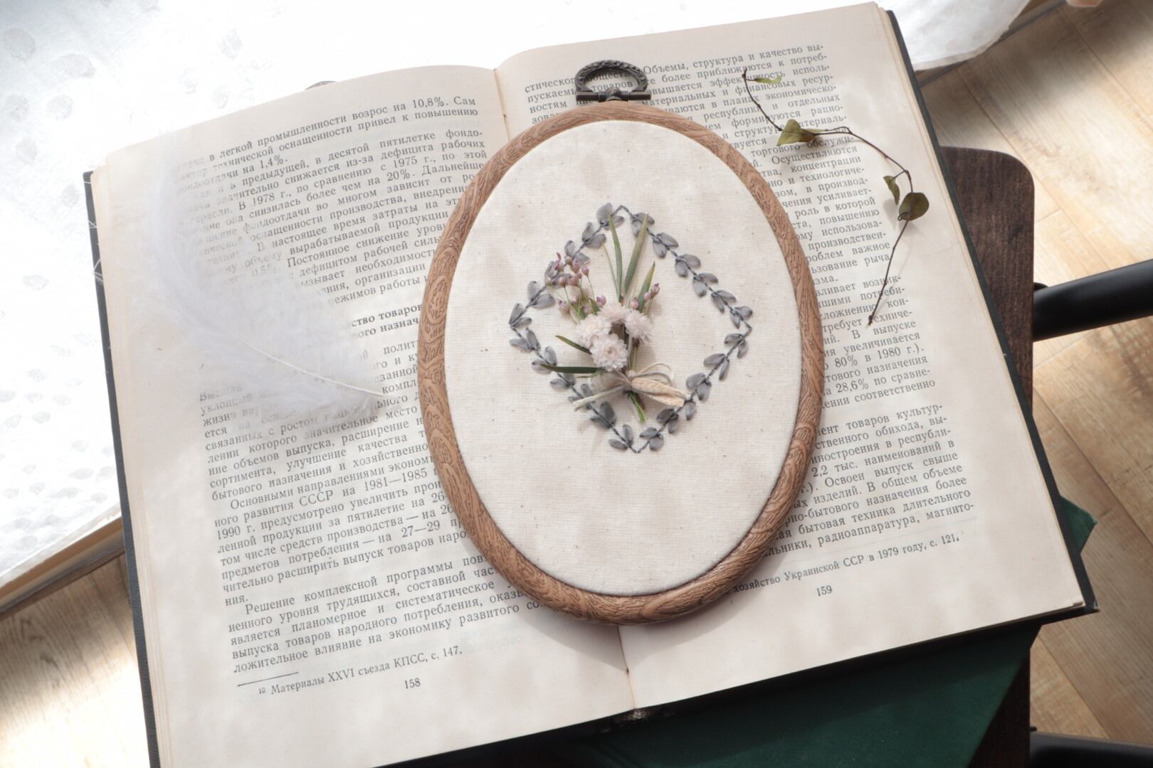本物の植物と刺繍を組合せた