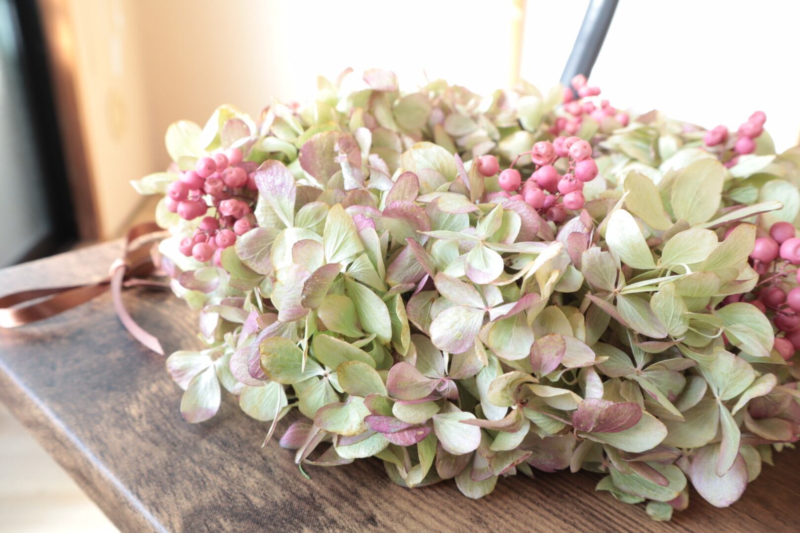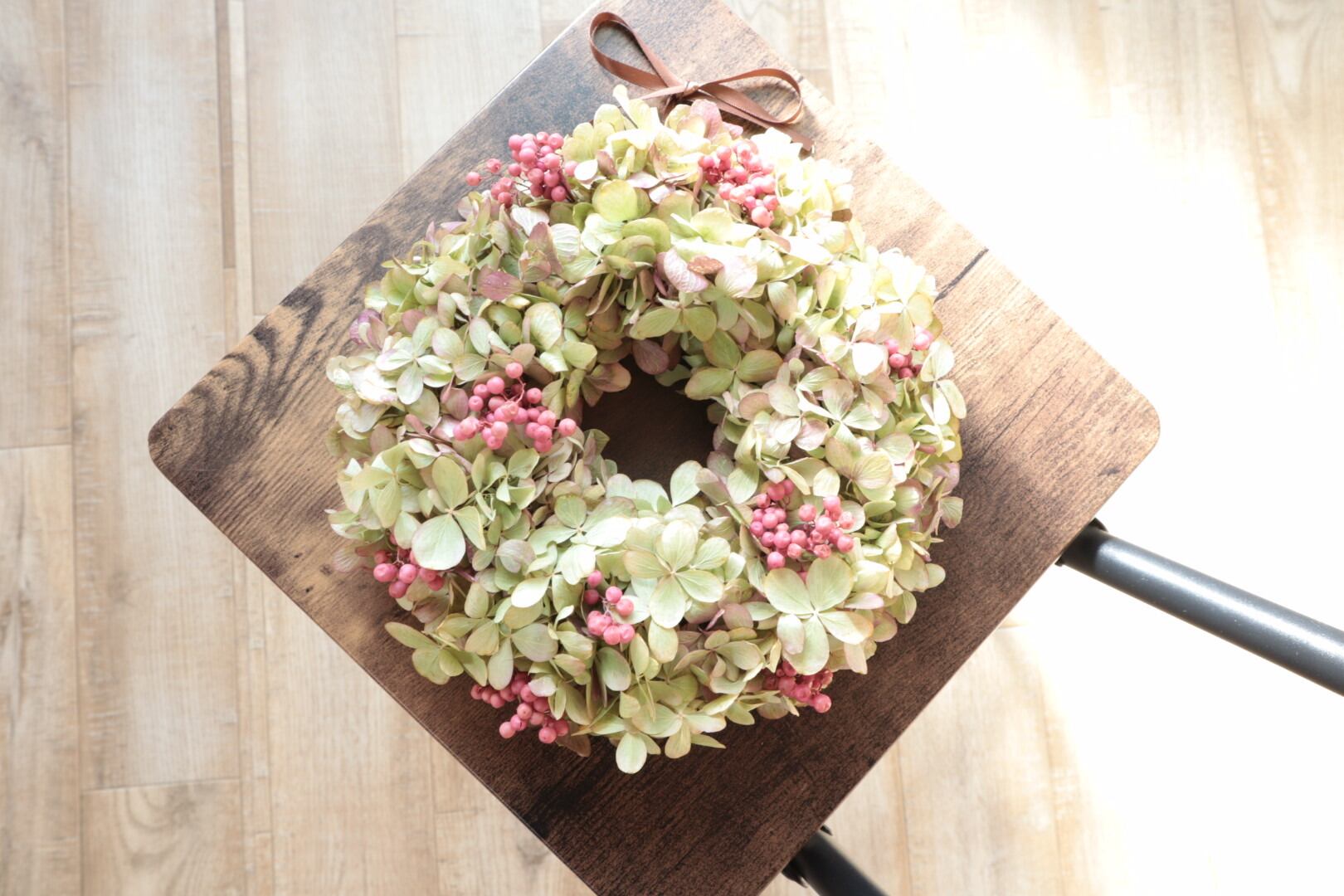 秋色あじさいとペッパーベリーのリース(ドライ)